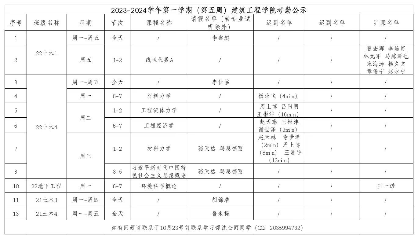 2023-2024学年第一学期(第五周)国产女同 考勤公示