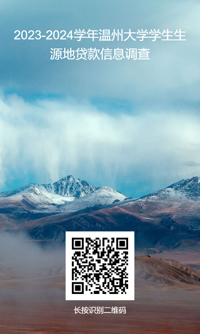 根据国家开发银行生源地信用助学贷款手续办理的要求,学生在生源地办理完毕信用助学贷款后,需要高校在限定时间内进行网上回执录入,请办理国开行生源地贷款的新老生,务必在9月20日前在网上完成《2023-2024学年温州大学学生生源地贷款信息调查》的填写,二维码如下: