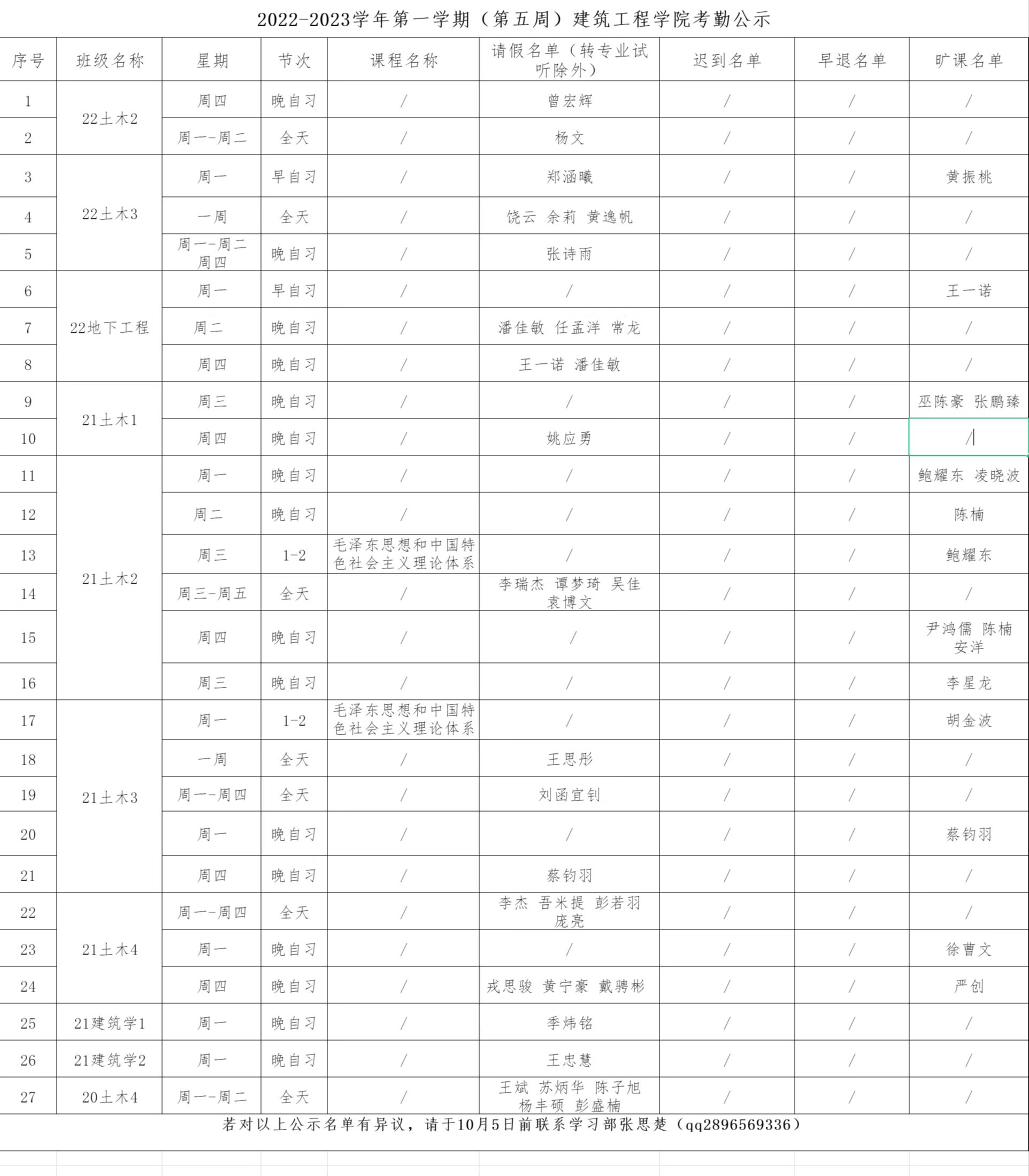 2022-2023学年第一学期(第五周)国产女同 考勤公示