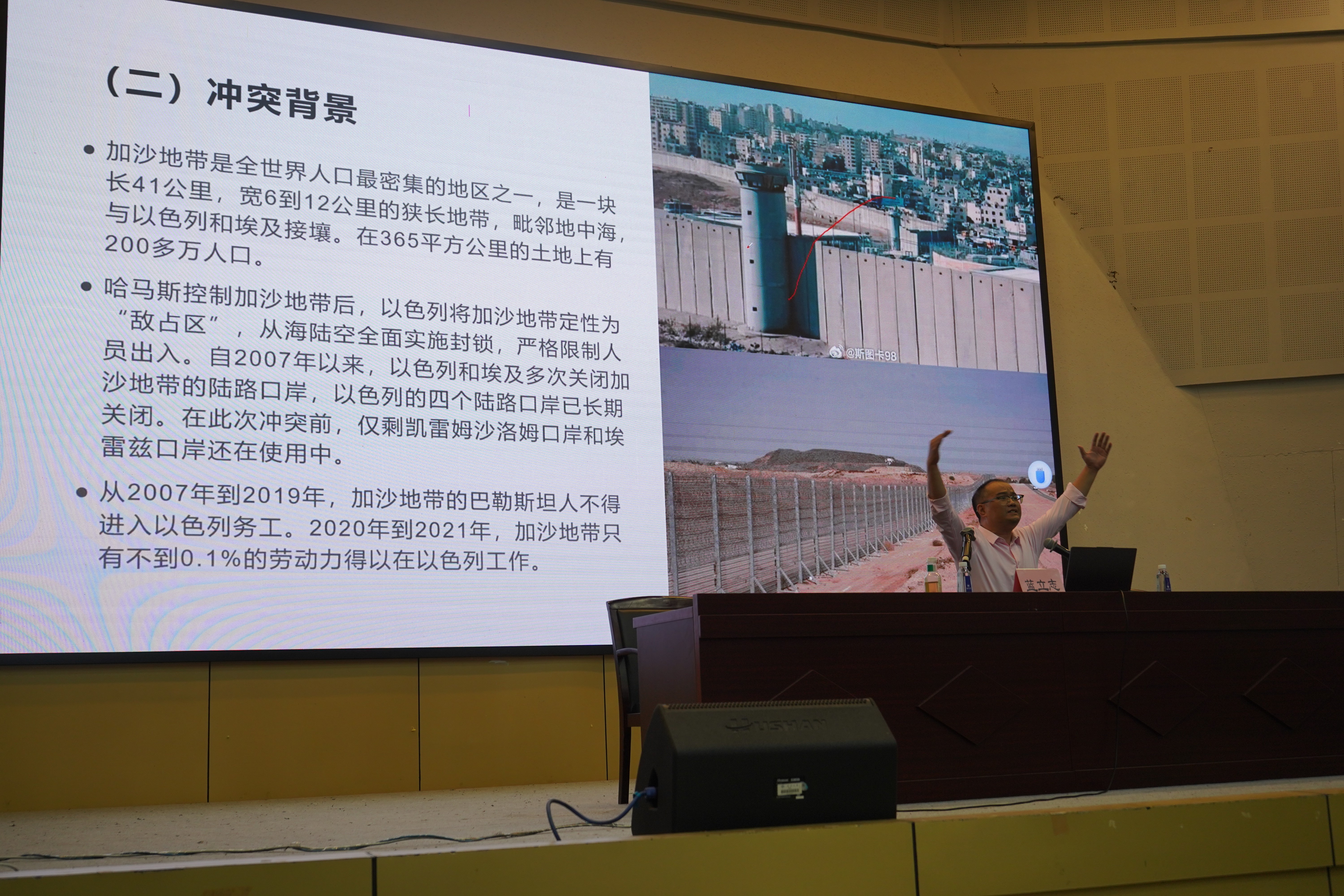 紧接着蓝立志老师从政治与经济的角度分析了这次巴以冲突的局势和在冲突之间的各方回应和专家观点,提出“在当今世界的政治博弈中,弱国只能成为棋子和棋盘,真正的持棋者是强国和大国”的观点。