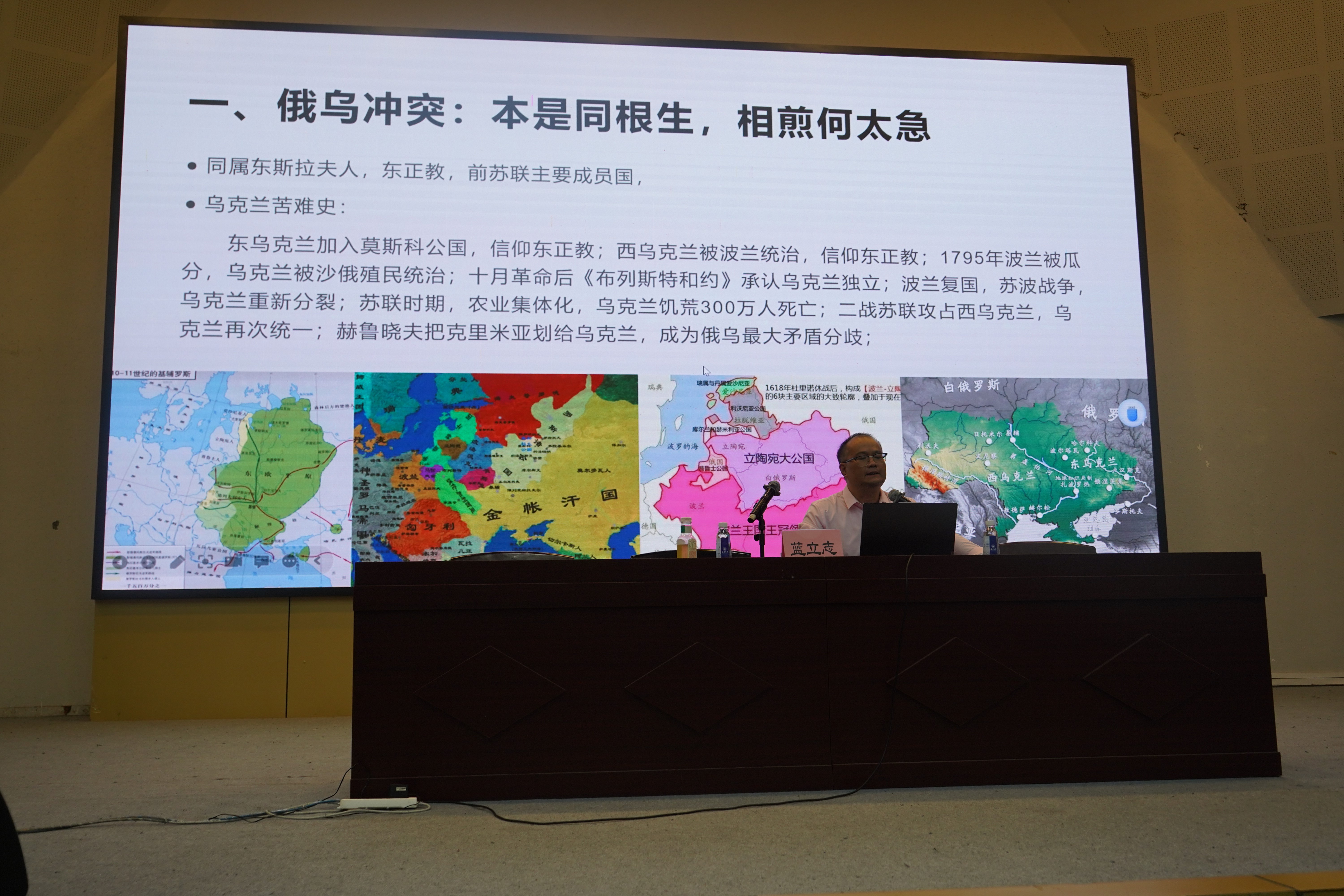 一开始蓝立志老师就讲解了俄乌冲突,介绍了两地的历史渊源,将冲突总体概括为“本是同根生,相煎何太急”,并以乌克兰的地形条件为切入口,将俄乌冲突的缘由进一步总结为四点:领土问题、新仇旧恨、北约东扩和作为背后推手的美国,而冲突的过程则体现出了两国之间的实力对比。