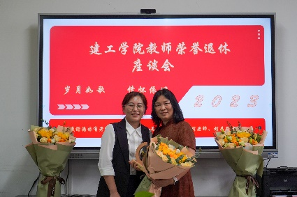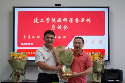 会上学院工会给退休老师们赠送了鲜花及荣休纪念水晶杯,大家纷纷与退休老师合影留念。