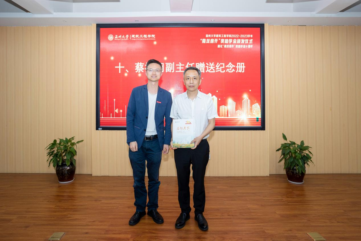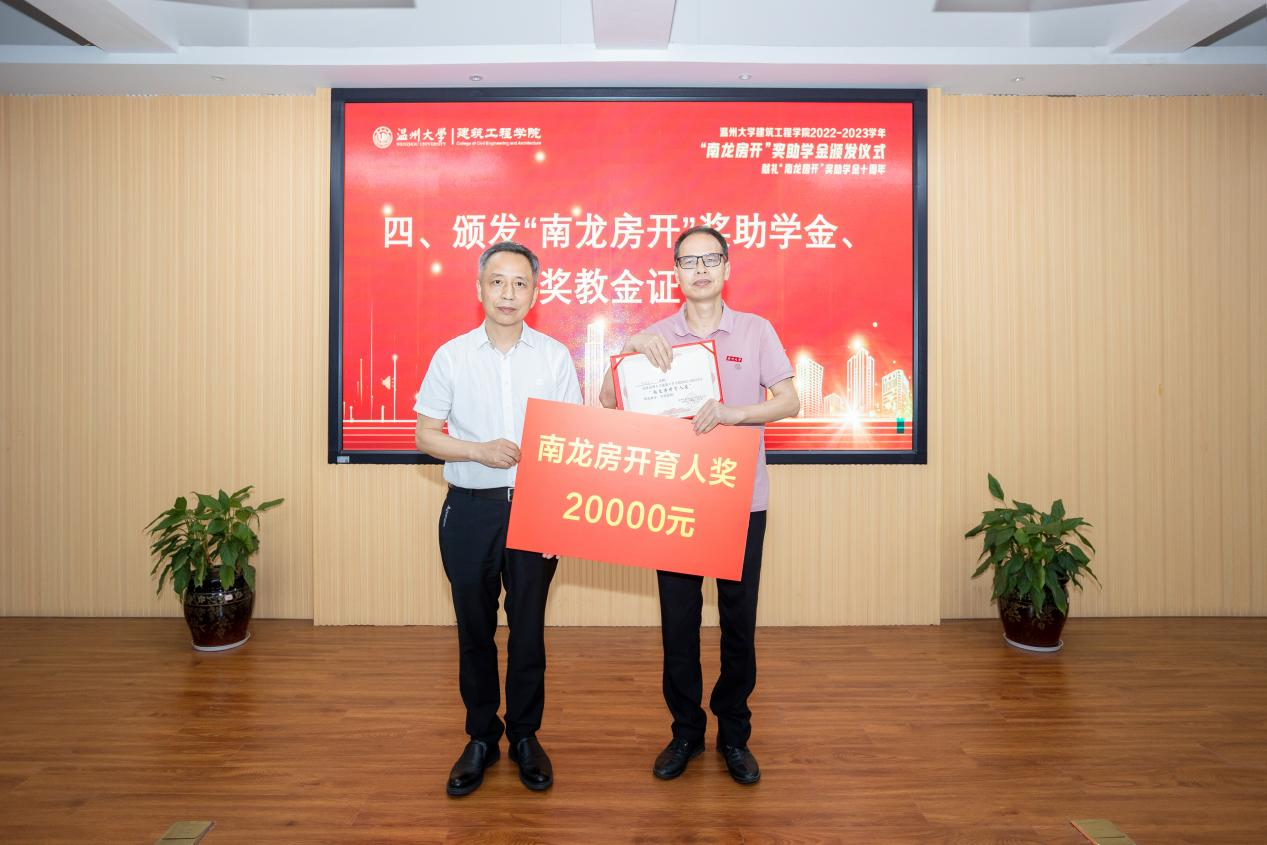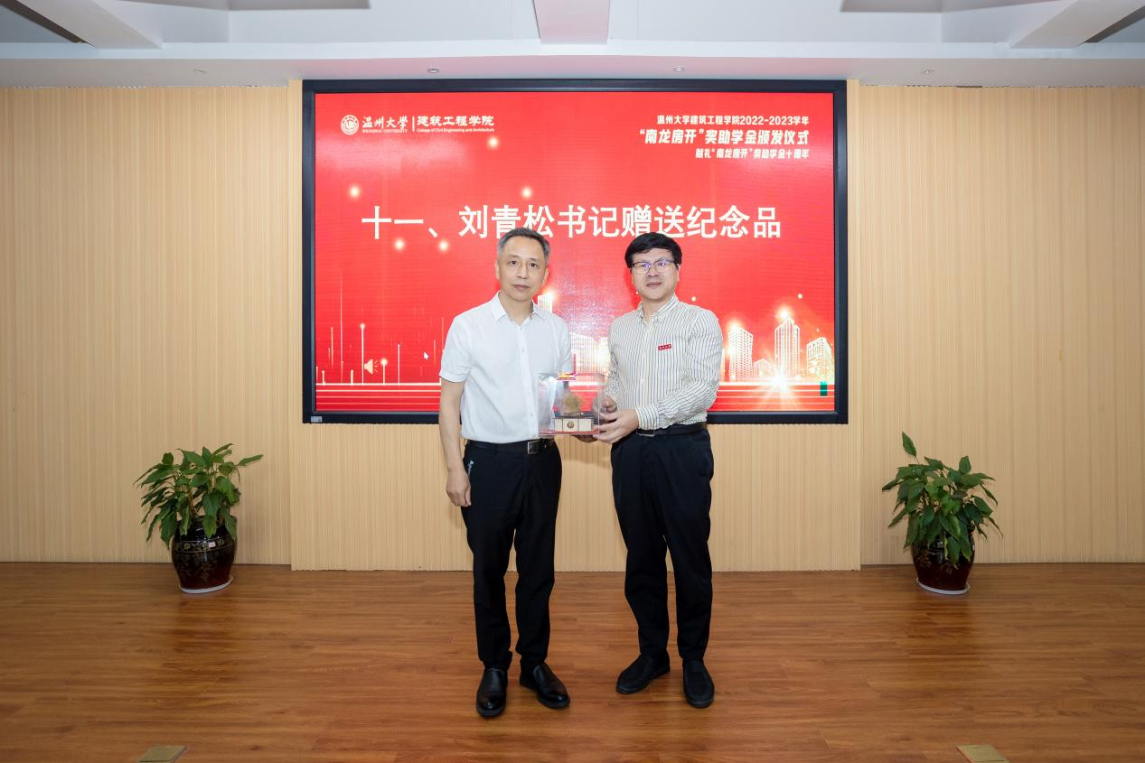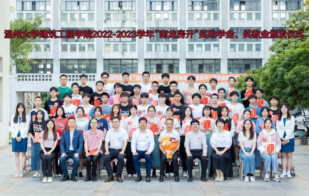 举行2022-2023学年“南龙房开”奖助学金、奖教金颁发仪式,学校党委副书记庄兴忠,温州南龙房地产开发有限公司董事长、工民建专业84级校友蒋维清,院长王军、院党委书记刘青松,校友与发展联络办公室副主任蔡振闹等出席。仪式由院团委书记、学工办主任郭瑞芬主持。