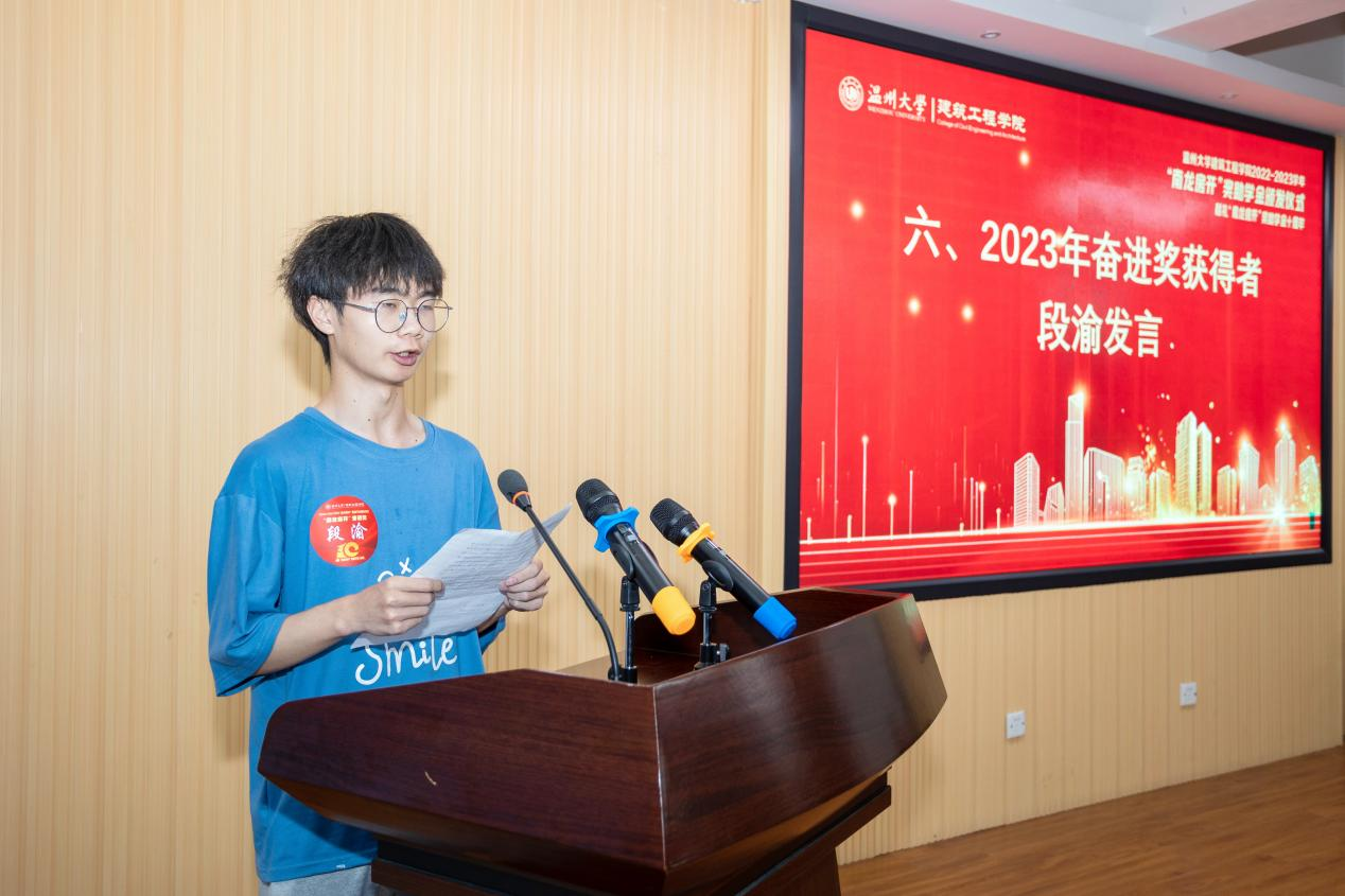 2023年“南龙房开”奋进奖获得者代表段渝致谢。他表达了真挚的谢意,并表示今后将更加努力学习,严于律己,不辜负蒋学长和学院老师的期望,不辜负“南龙房开”助学金的帮助,怀着一颗感恩的心,争做一名品学皆优的学生,传承和弘扬蒋先生关心和帮助他人的善举。
