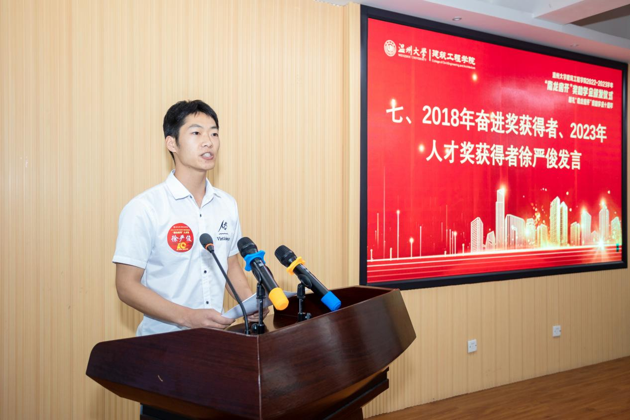 2018年奋进奖获得者、2023年人才奖获得者徐严俊致谢发言。他汇报了在四年大学生活和两年军旅生涯中的成长蜕变,并表示在工作岗位上继续勤奋学习,在国家和社会需要时贡献自己的一份力量,回报蒋先生对其的关爱。