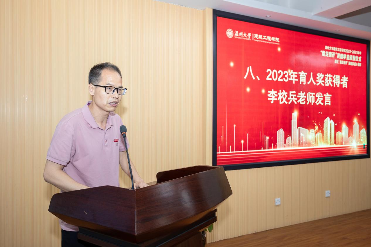 2023年育人奖获得者李校兵老师致谢发言。他表示感谢领导、同事、家人们的帮助,学生们的信任和校友们的厚爱,相信在大家共同努力下,学院未来前行之路一定会像榕庭书屋的灯光一样靓丽璀璨。
