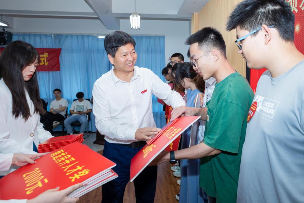 蒋维清先生为育人奖获得者和32名奋进奖获得者颁发荣誉证书与奖助学金牌。